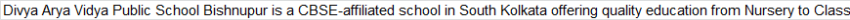 Description: Divya Arya Vidya Public School Bishnupur is a CBSE-affiliated school in South Kolkata offering quality education from Nursery to Class XII. The school provides a large campus, experienced teachers, modern facilities, transport services, and a strong focus on academics, values, and co-curricular activities.