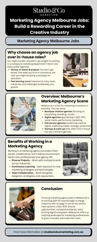 Searching for a marketing agency melbourne job? If you are hungry and ready to make your mark, Studio & Co Marketing have some awesome opportunities for innovative thinkers Join a passionate group of individuals shaping brands through digital strategy, design and innovation. Begin by searching for your dream marketing job develop, learn and prosper with Studio & Co Marketing in the heart of Melbourne! https://studioandcomarketing.com.au/